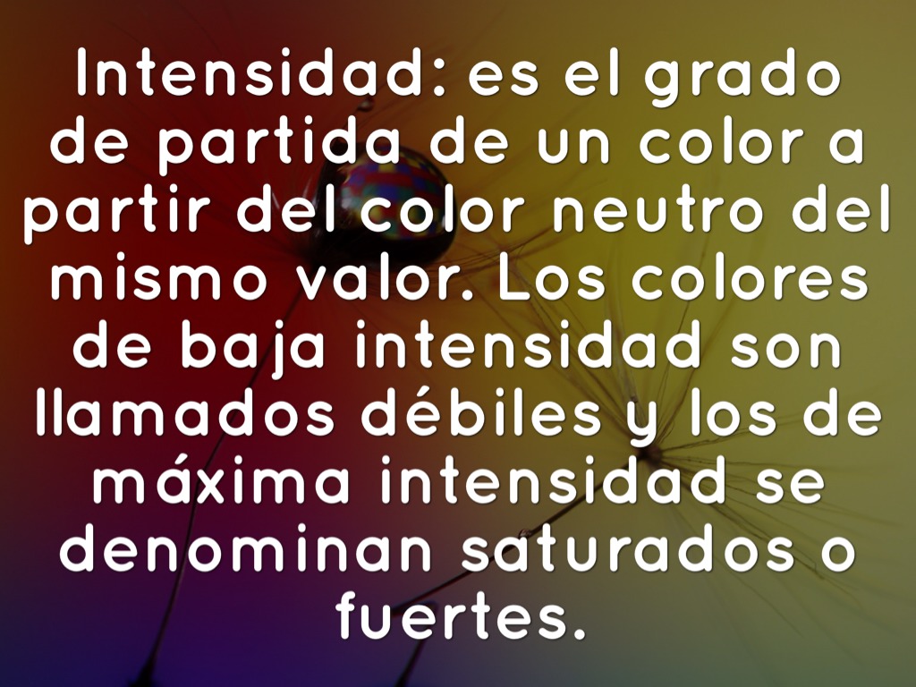 Intensidad: es el grado de partida de un color a partir del color neutro del mismo valor. Los colores de baja intensidad son llamados débiles y los de máxima intensidad se denominan saturados o fuertes.