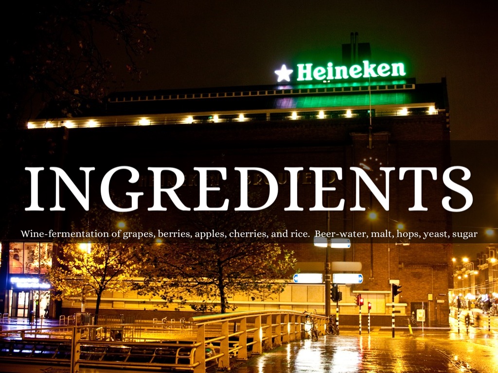 Wine-fermentation of grapes, berries, apples, cherries, and rice. Beer-water, malt, hops, yeast, sugar