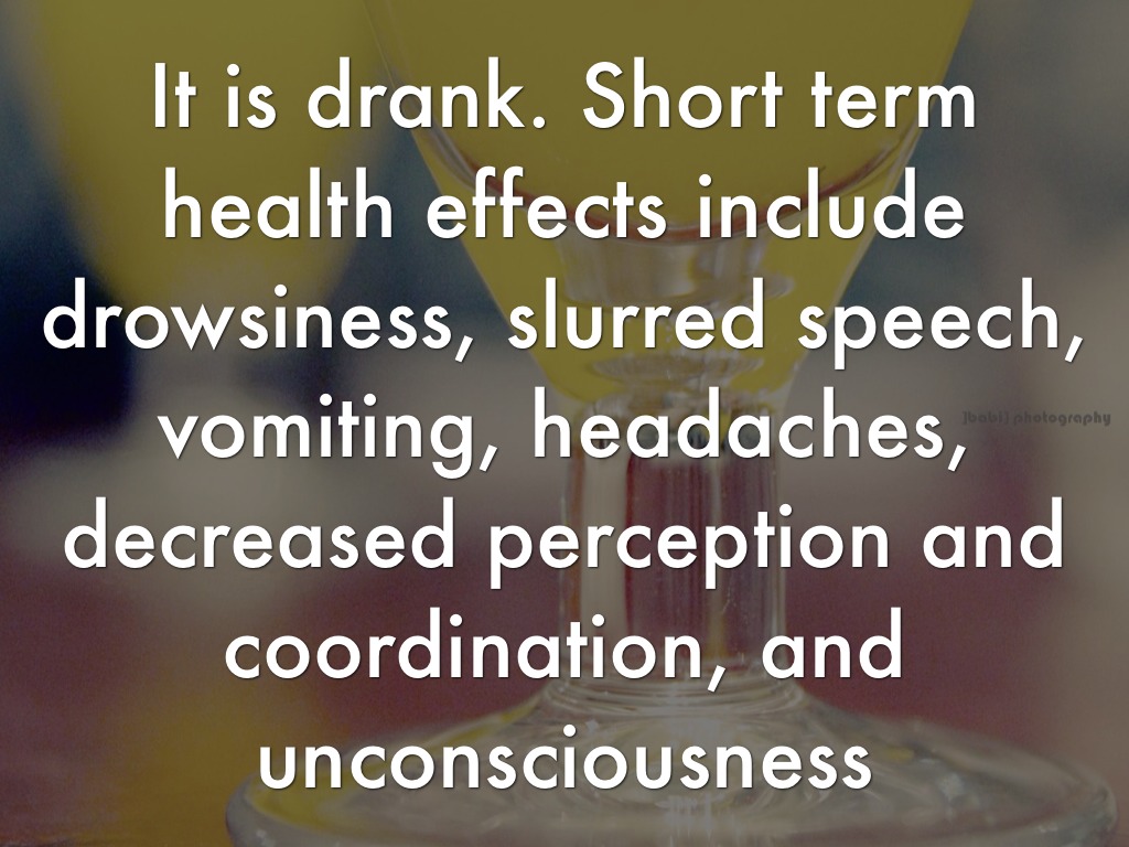 It is drank. Short term health effects include drowsiness, slurred speech, vomiting, headaches, decreased perception and coordination, and unconsciousness
