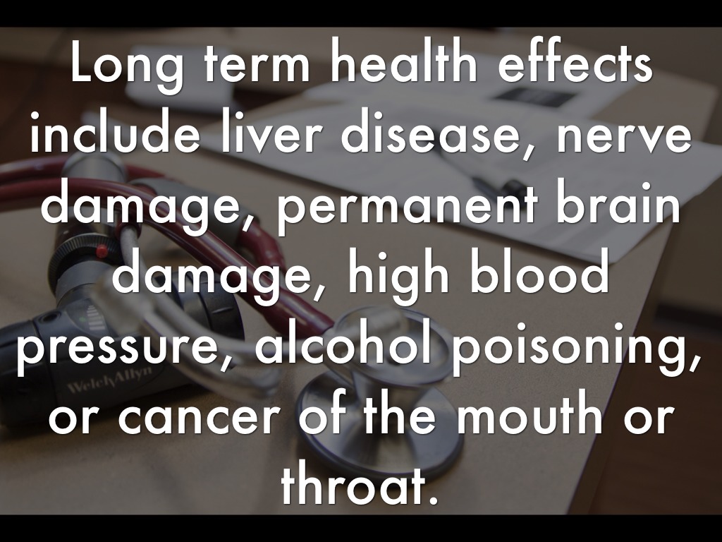Long term health effects include liver disease, nerve damage, permanent brain damage, high blood pressure, alcohol poisoning, or cancer of the mouth or throat.