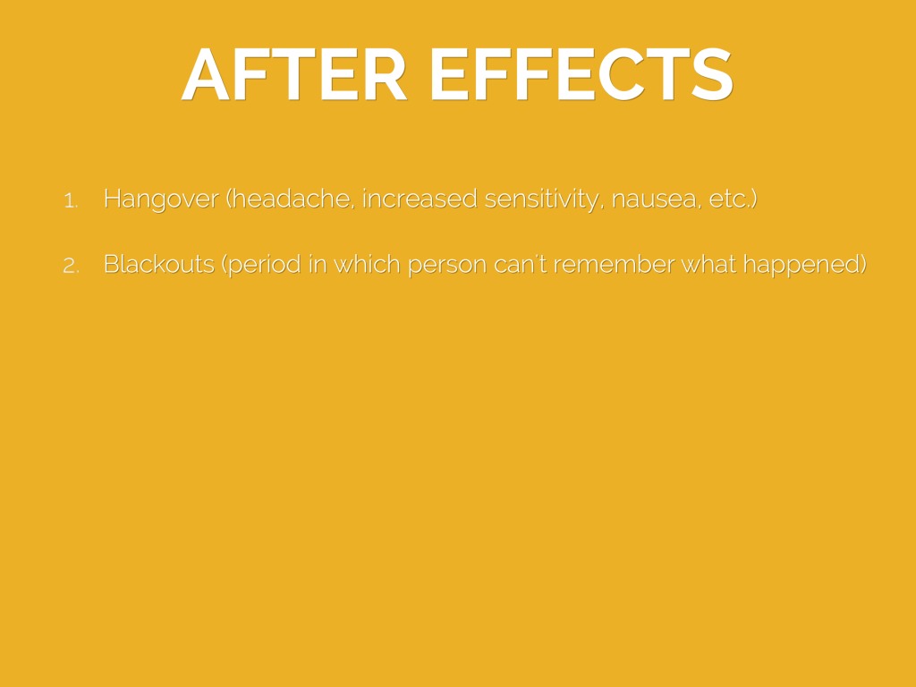 - Hangover (headache, increased sensitivity, nausea, etc.)