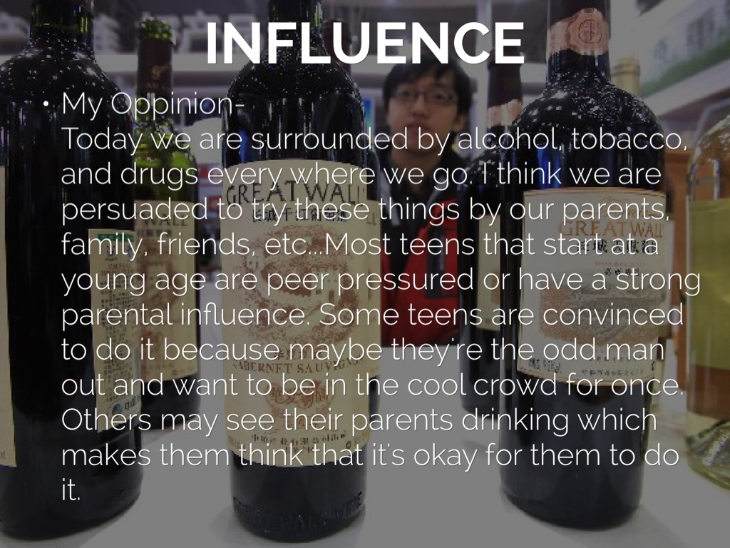 My Oppinion- Today we are surrounded by alcohol, tobacco, and drugs every where we go. I think we are persuaded to try these things by our parents, family, friends, etc...Most teens that start at a young age are peer pressured or have a strong parental influence. Some teens are convinced to do it because maybe they're the odd man out and want to be in the cool crowd for once. Others may see their parents drinking which makes them think that it's okay for them to do it.