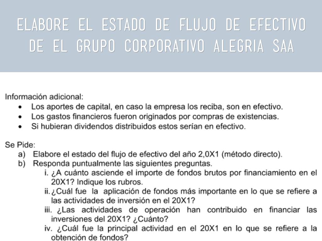 Elabore el estado de flujo de efectivo de el grupo corporativo ALEGRIA SAA