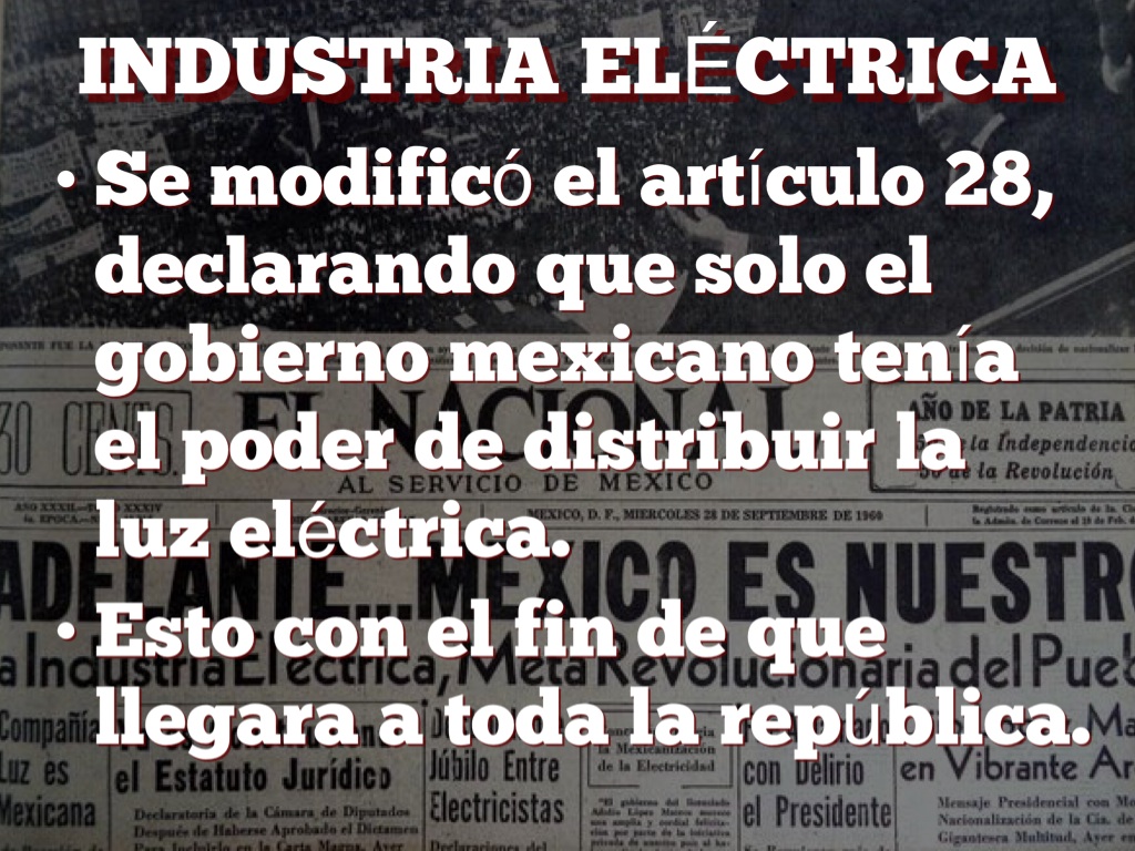 Se modificó el artículo 28, declarando que solo el gobierno mexicano tenía el poder de distribuir la luz eléctrica.