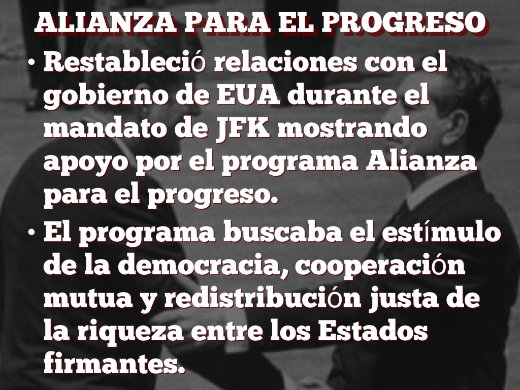 Restableció relaciones con el gobierno de EUA durante el mandato de JFK mostrando apoyo por el programa Alianza para el progreso.