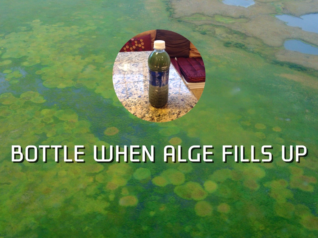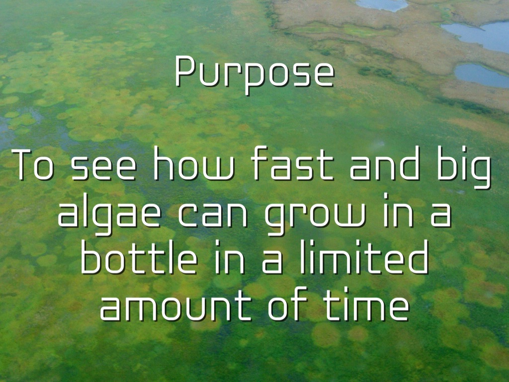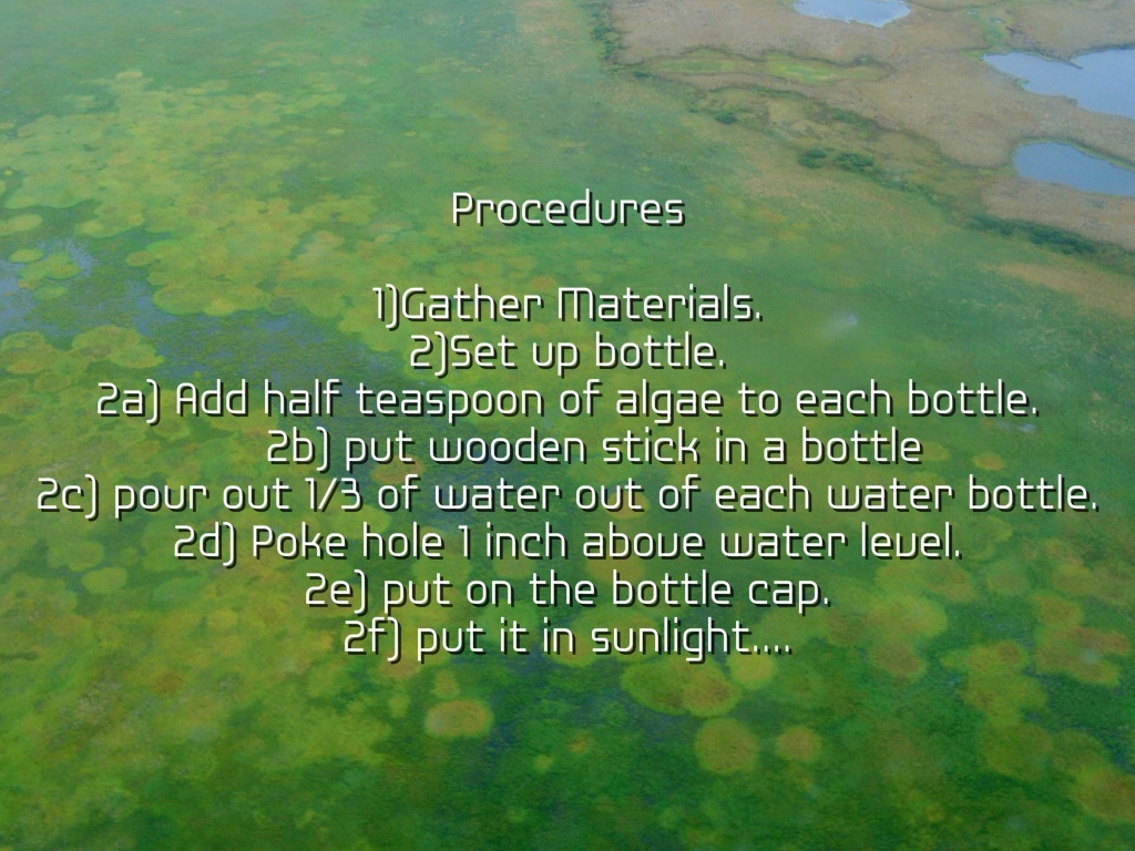 1)Collect Materials. 2)Set up bottle. 2a) Add half teaspoon of algae in the bottle. 2b) put wooden stick in a bottle 2c) pour out 1/3 of water out of the water bottle. 2d) Poke hole 1 inch above water level. 2e) put on the bottle cap. 2f) put it in sunlight. 3)Wait for algae to grow 4) For the bottle measure growth then record data.