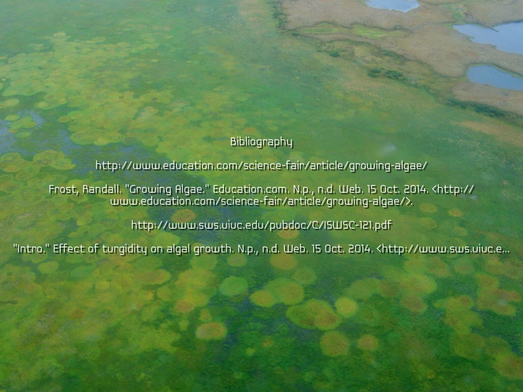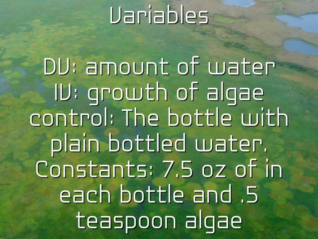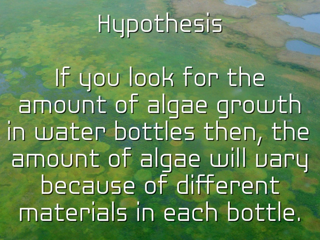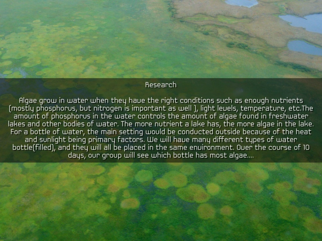 Algae grow in water when they have the right conditions such as enough nutrients (mostly phosphorus, but nitrogen is important as well ), light levels, temperature, etc.The amount of phosphorus in the water controls the amount of algae found in freshwater lakes and other bodies of water. The more nutrient a lake has, the more algae in the lake. For a bottle of water, the main setting would be conducted outside because of the heat and sunlight being primary factors. We will have many different types of water bottle(filled), and they will all be placed in the same environment. Over the course of 10 days, our group will see which bottle has most algae. What are algae? Algae is primarily a water creature, one-celled or multicellular plant-like organisms that lack true stems, roots, and leaves, but usually contain chlorophyll. There are both marine and freshwater algae, and algae are found almost everywhere on earth. The Washington Department of Ecology's algae program focuses on algae problems in freshwater. Pond scum is algae (mostly), the green slime on rocks in a stream is also algae, as is the pea soup green seen in some nutrient-enriched lakes. Algae may grow for a variety of reasons, but nutrients limit algae growth. Any long-term solution to algae management involves nutrient reduction. Taking steps to manage nutrient inputs to a water body is crucial, although many times nutrient management involves managing the entire watershed and not just the area immediately around the lake. Nutrients throughout the watershed may be contributing to the algae problem. Local jurisdictions must become involved with stormwater or agricultural issues or other external nutrient sources. In these cases, lake restoration techniques may be needed. Lake residents can employ the best management practices to help reduce nutrients. In the short-term, there are control options that may lead to a temporary reduction in the growth of algae.