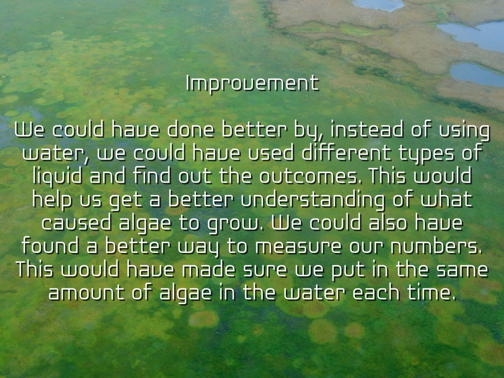 We could have done better by, instead of using water, we could have used different types of liquid and find out the outcomes. This would help us get a better understanding of what caused algae to grow. We could also have found a better way to measure our numbers. This would have made sure we put in the same amount of algae in the water each time.