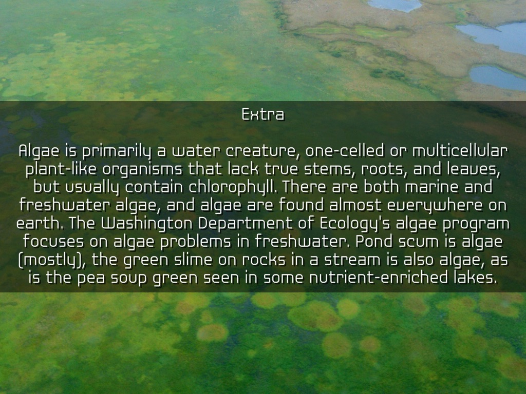 Algae is primarily a water creature, one-celled or multicellular plant-like organisms that lack true stems, roots, and leaves, but usually contain chlorophyll. There are both marine and freshwater algae, and algae are found almost everywhere on earth. The Washington Department of Ecology's algae program focuses on algae problems in freshwater. Pond scum is algae (mostly), the green slime on rocks in a stream is also algae, as is the pea soup green seen in some nutrient-enriched lakes.