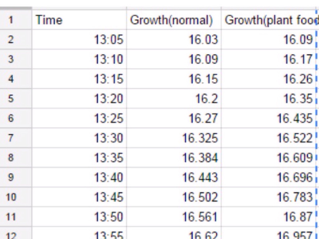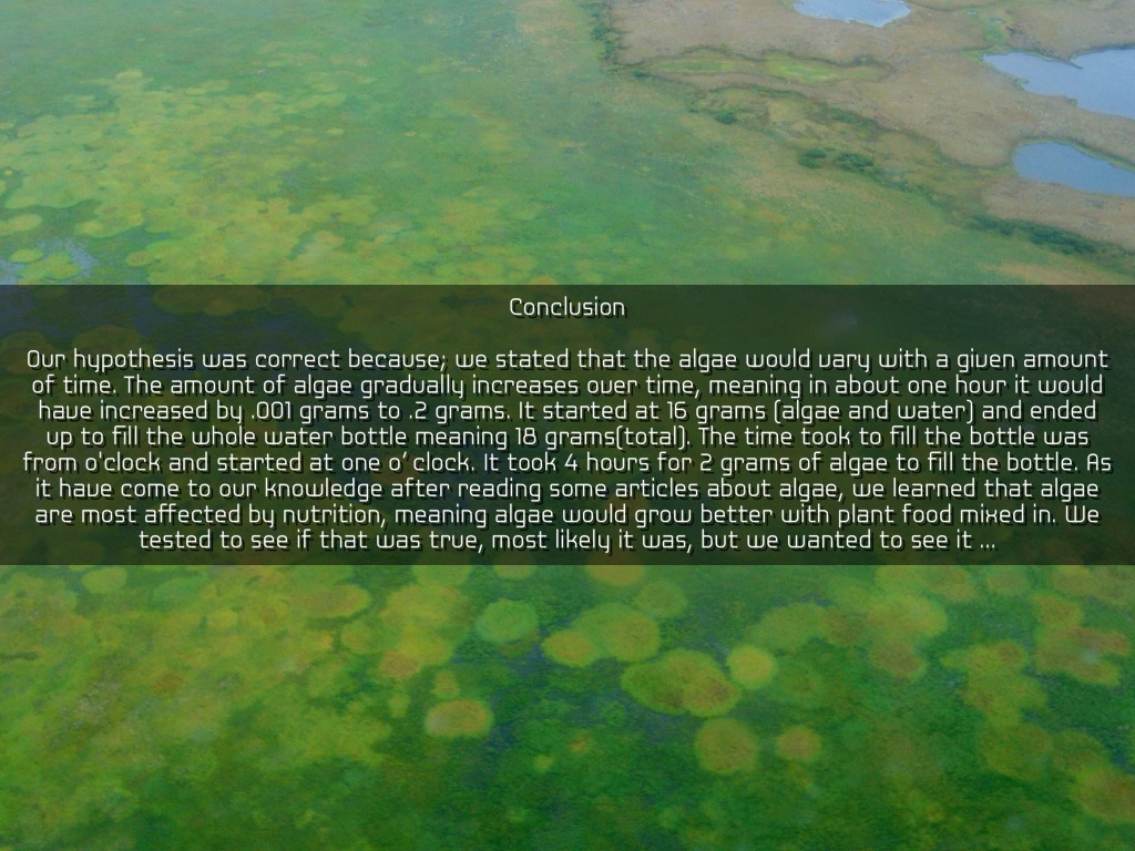Our hypothesis was correct because; we stated that the algae would vary with a given amount of time. The amount of algae gradually increases over time, meaning in about one hour it would have increased by .001 grams to .2 grams. It started at 16 grams (algae and water) and ended up to fill the whole water bottle meaning 18 grams(total). The time took to fill the bottle was from o'clock and started at one o’ clock. It took 4 hours for 2 grams of algae to fill the bottle. As it have come to our knowledge after reading some articles about algae, we learned that algae are most affected by nutrition, meaning algae would grow better with plant food mixed in. We tested to see if that was true, most likely it was, but we wanted to see it with our own eyes and witness the growth of algae through a period of time.The results turned out to be a positive correlation.