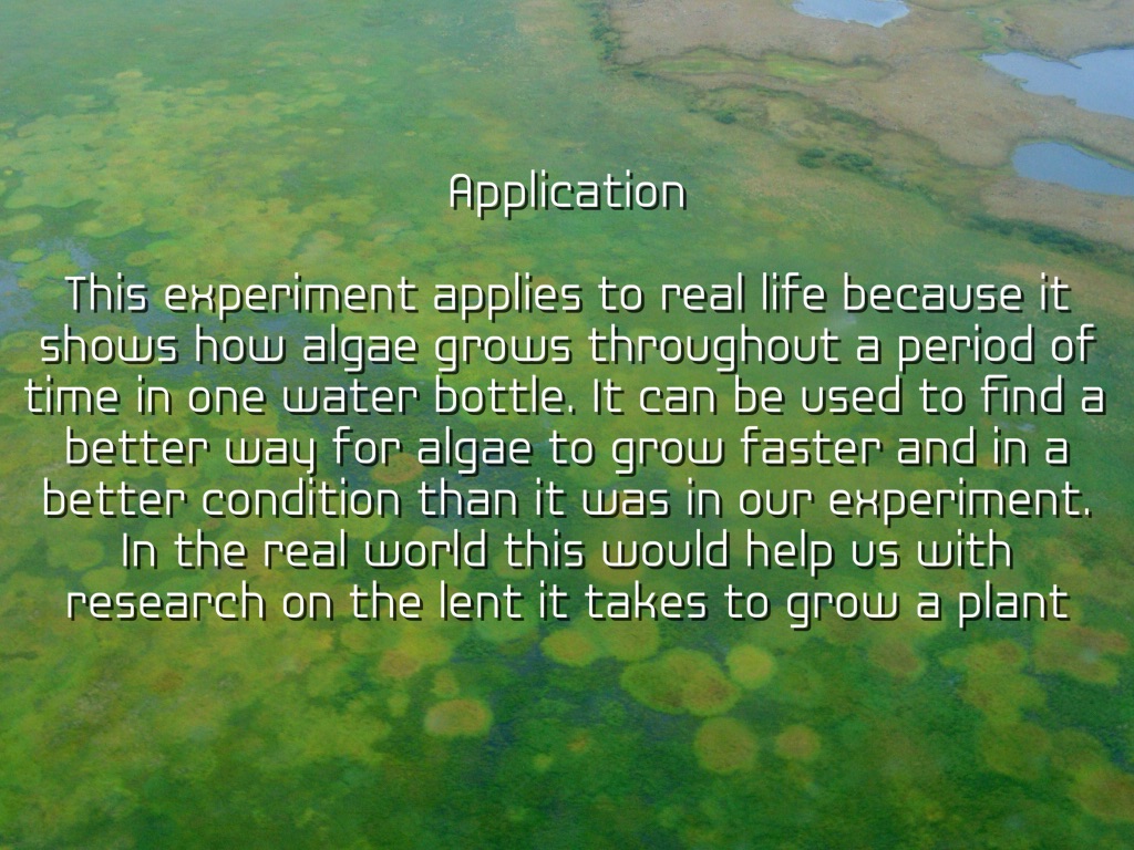 This experiment applies to real life because it shows how algae grows throughout a period of time in one water bottle. It can be used to find a better way for algae to grow faster and in a better condition than it was in our experiment. In the real world this would help us with research on the lent it takes to grow a plant