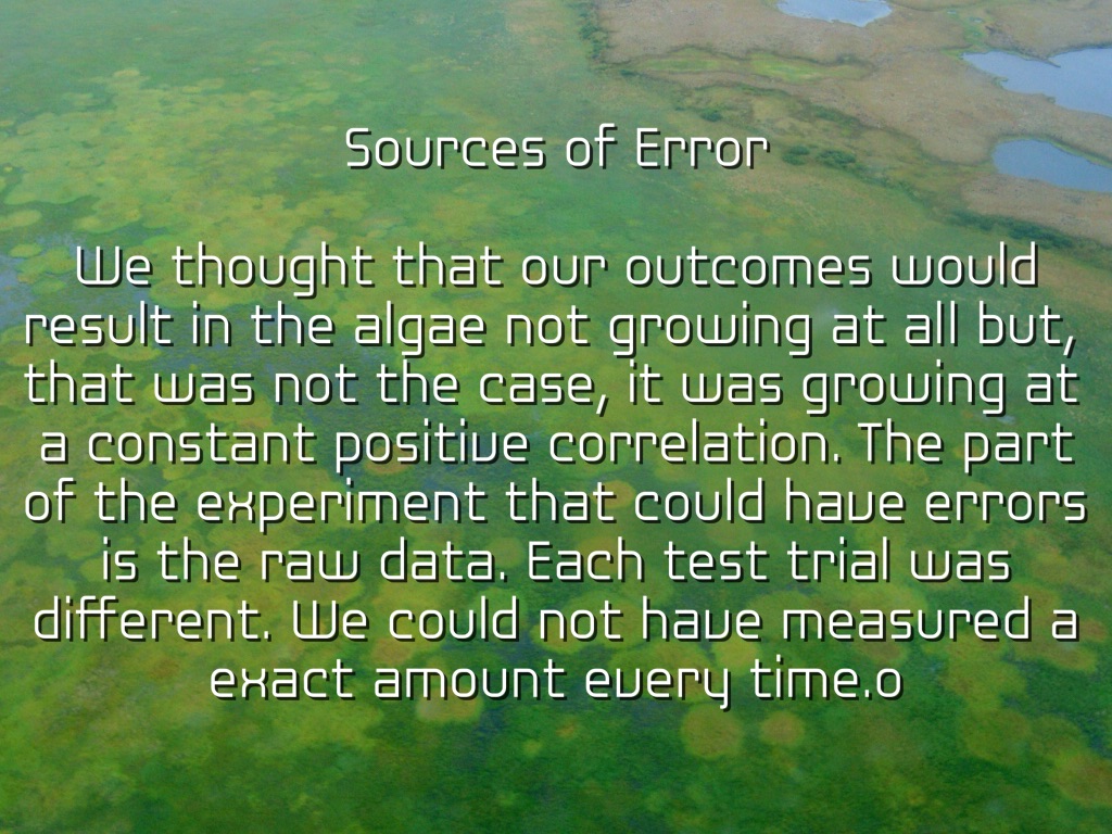 We thought that our outcomes would result in the algae not growing at all but, that was not the case, it was growing at a constant positive correlation. The part of the experiment that could have errors is the raw data. Each test trial was different. We could not have measured a exact amount every time.o