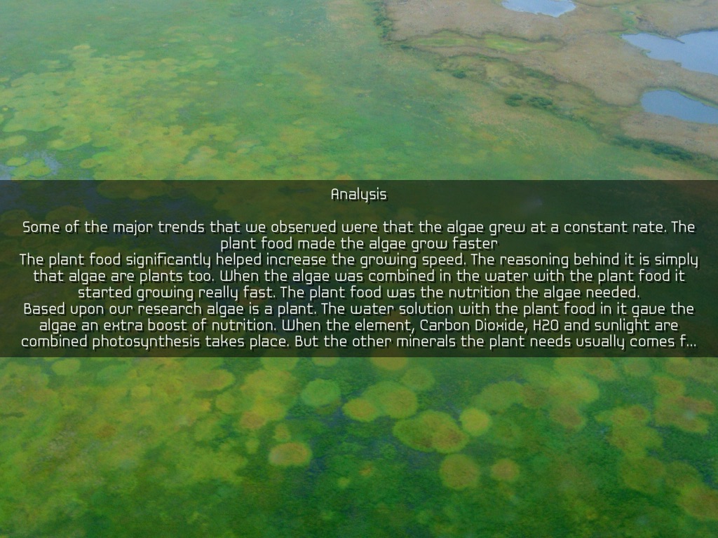 Some of the major trends that we observed were that the algae grew at a constant rate. The plant food made the algae grow faster The plant food significantly helped increase the growing speed. The reasoning behind it is simply that algae are plants too. When the algae was combined in the water with the plant food it started growing really fast. The plant food was the nutrition the algae needed. Based upon our research algae is a plant. The water solution with the plant food in it gave the algae an extra boost of nutrition. When the element, Carbon Dioxide, H20 and sunlight are combined photosynthesis takes place. But the other minerals the plant needs usually comes from soil. We used plant food as a substitution for it and the plant grew much faster because it had the correct element to grow.