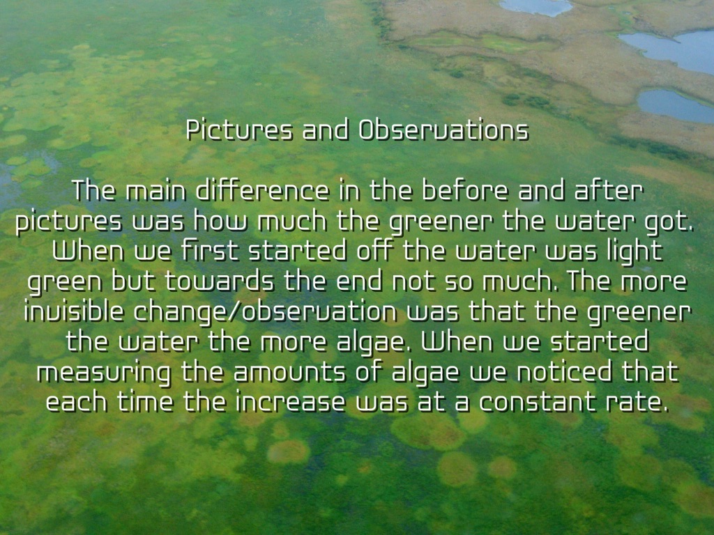 The main difference in the before and after pictures was how much and how fast the greener the water spread. When we first started off the water was light green but towards the end not so much. The more invisible change/observation was that the greener the water the more algae. When we started measuring the amounts of algae we noticed that each time the increase was at a constant rate.