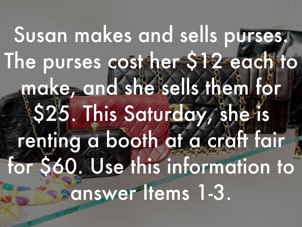 Susan makes and sells purses. The purses cost her $12 each to make, and she sells them for $25. This Saturday, she is renting a booth at a craft fair for $60. Use this information to answer Items 1-3.