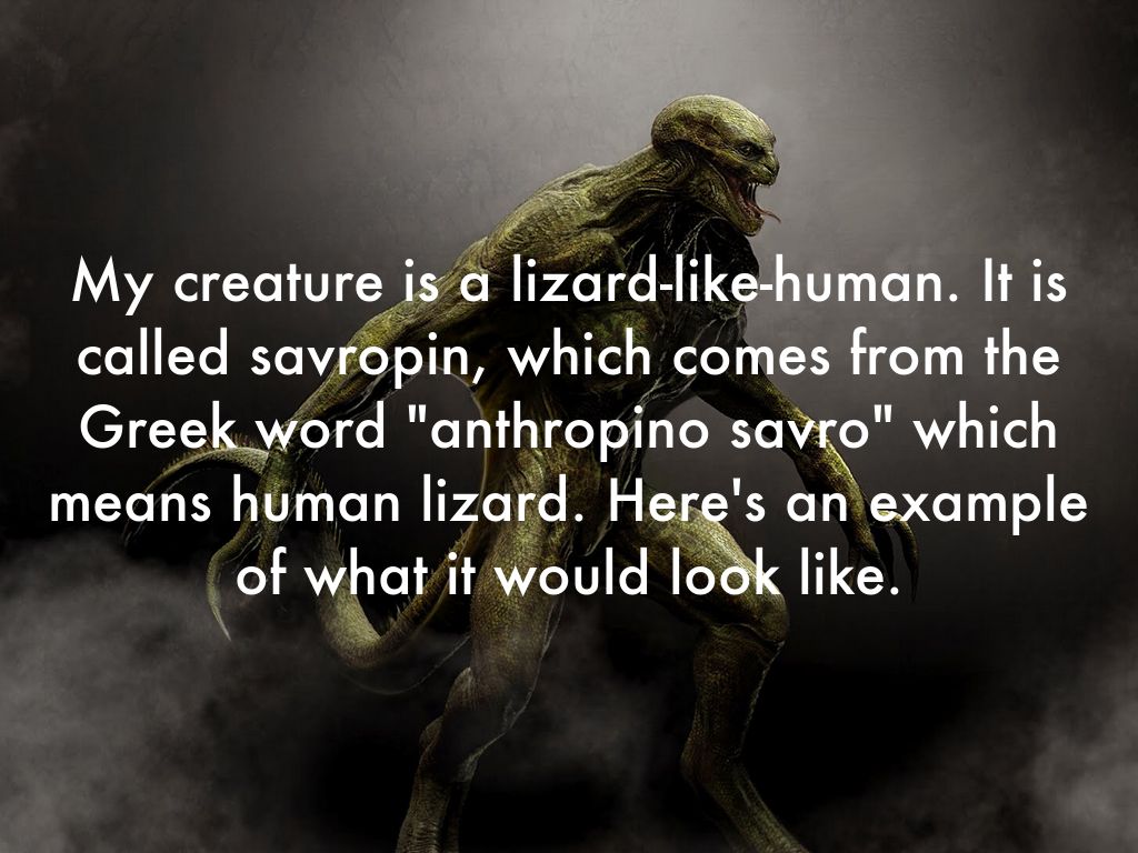 My creature is a lizard-like-human. It is called savropin, which comes from the Greek word "anthropino savro" which means human lizard. Here's an example of what it would look like.
