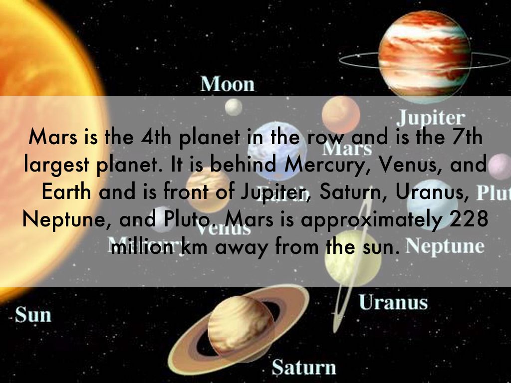 Mars is the 4th planet in the row and is the 7th largest planet. It is behind Mercury, Venus, and Earth and is front of Jupiter, Saturn, Uranus, Neptune, and Pluto. Mars is approximately 228 million km away from the sun.