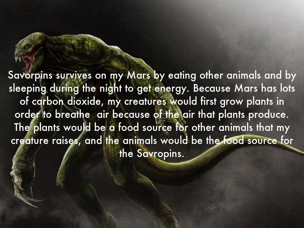 Savorpins survives on my Mars by eating other animals and by sleeping during the night to get energy. Because Mars has lots of carbon dioxide, my creatures would first grow plants in order to breathe air because of the air that plants produce. The plants would be a food source for other animals that my creature raises, and the animals would be the food source for the Savropins.