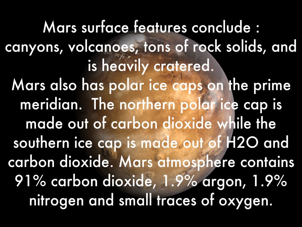 Mars also has polar ice caps on the prime meridian. The northern polar ice cap is made out of carbon dioxide while the southern ice cap is made out of H2O and carbon dioxide. Mars atmosphere contains 91% carbon dioxide, 1.9% argon, 1.9% nitrogen and small traces of oxygen.