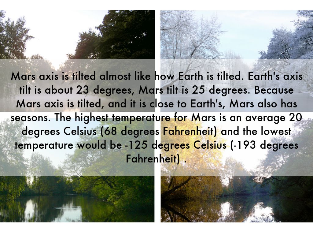 Mars axis is tilted almost like how Earth is tilted. Earth's axis tilt is about 23 degrees, Mars tilt is 25 degrees. Because Mars axis is tilted, and it is close to Earth's, Mars also has seasons. The highest temperature for Mars is an average 20 degrees Celsius (68 degrees Fahrenheit) and the lowest temperature would be -125 degrees Celsius (-193 degrees Fahrenheit) .