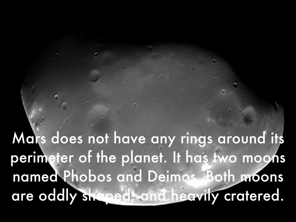 Mars does not have any rings around its perimeter of the planet. It has two moons named Phobos and Deimos. Both moons are oddly shaped, and heavily cratered.