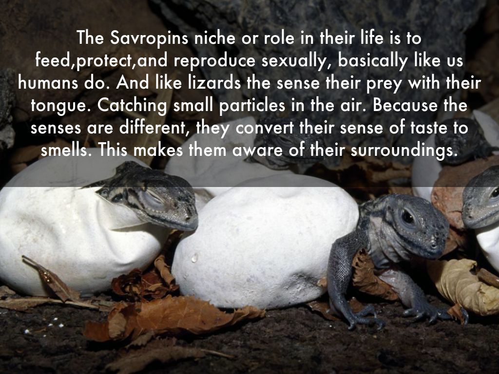 The Savropins niche or role in their life is to feed,protect,and reproduce sexually, basically like us humans do. And like lizards the sense their prey with their tongue. Catching small particles in the air. Because the senses are different, they convert their sense of taste to smells. This makes them aware of their surroundings.