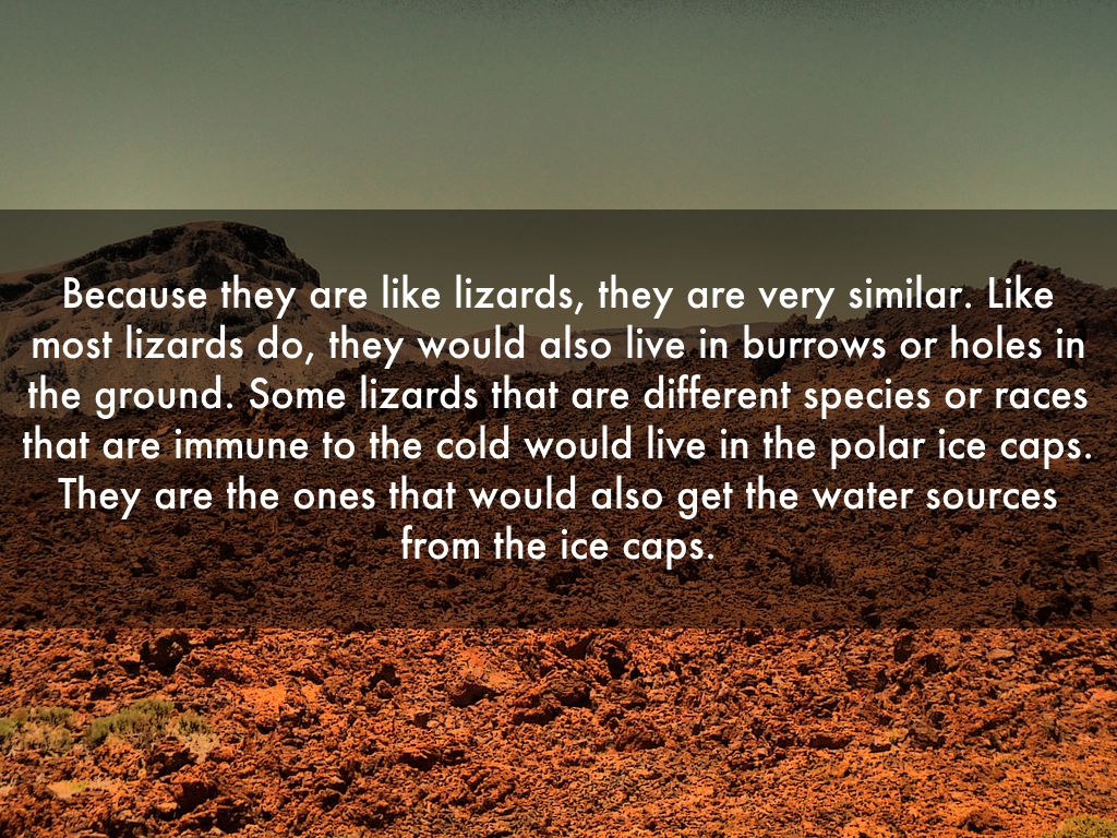 Because they are like lizards, they are very similar. Like most lizards do, they would also live in burrows or holes in the ground. Some lizards that are different species or races that are immune to the cold would live in the polar ice caps. They are the ones that would also get the water sources from the ice caps.