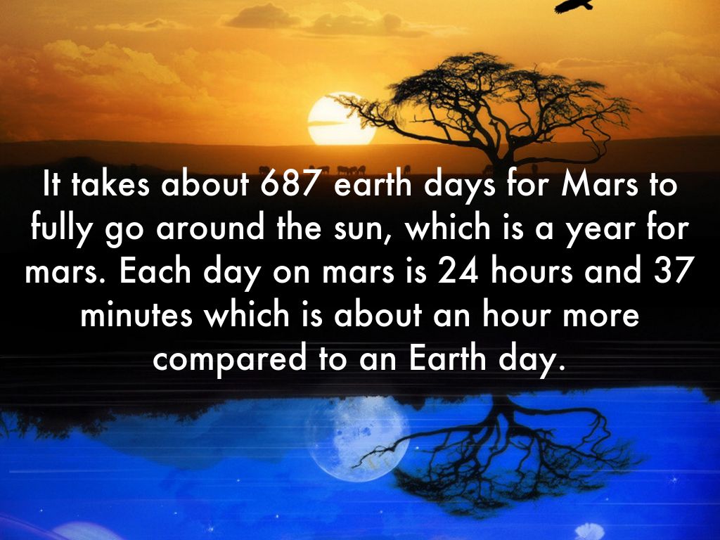 It takes about 687 earth days for Mars to fully go around the sun, which is a year for mars. Each day on mars is 24 hours and 37 minutes which is about an hour more compared to an Earth day.