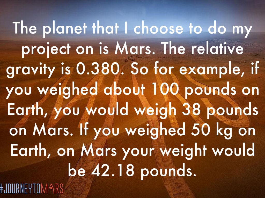 The planet that I choose to do my project on is Mars. The relative gravity is 0.380. So for example, if you weighed about 100 pounds on Earth, you would weigh 38 pounds on Mars. If you weighed 50 kg on Earth, on Mars your weight would be 42.18 pounds.