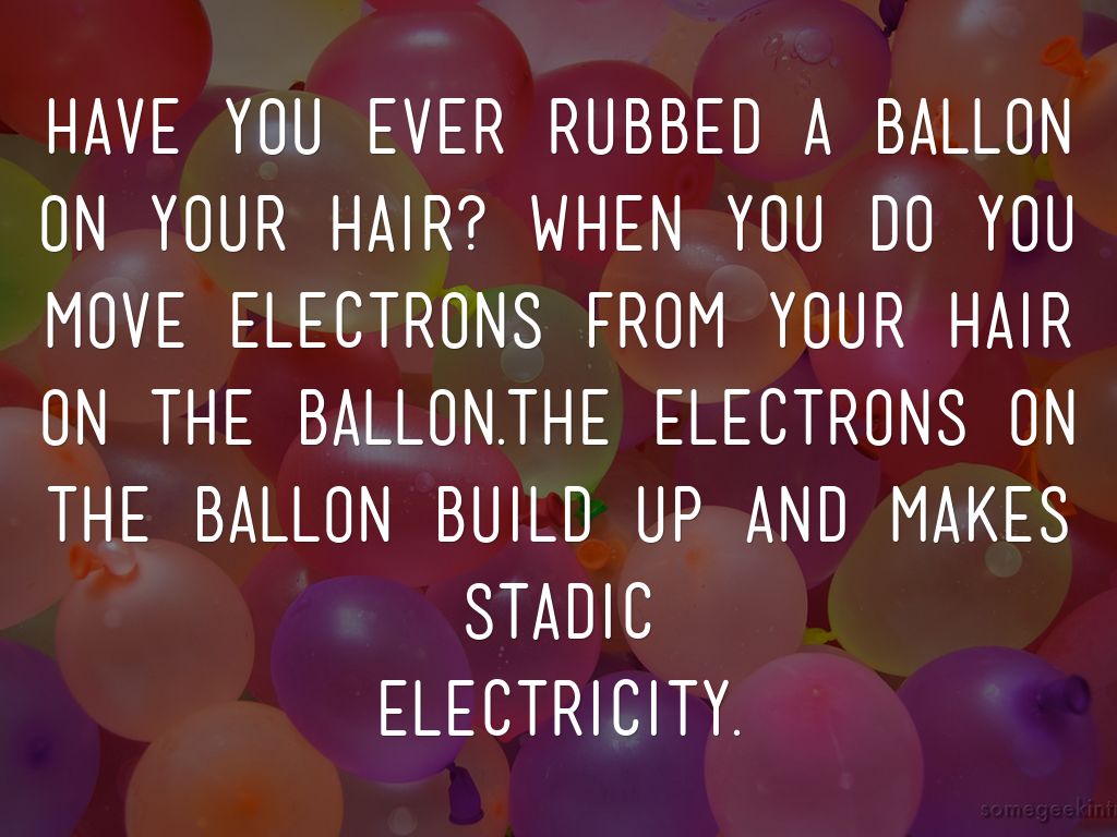 Have you ever rubbed a ballon on your hair? When you do you move electrons from your hair on the ballon.The electrons on the ballon build up and makes stadic Electricity.