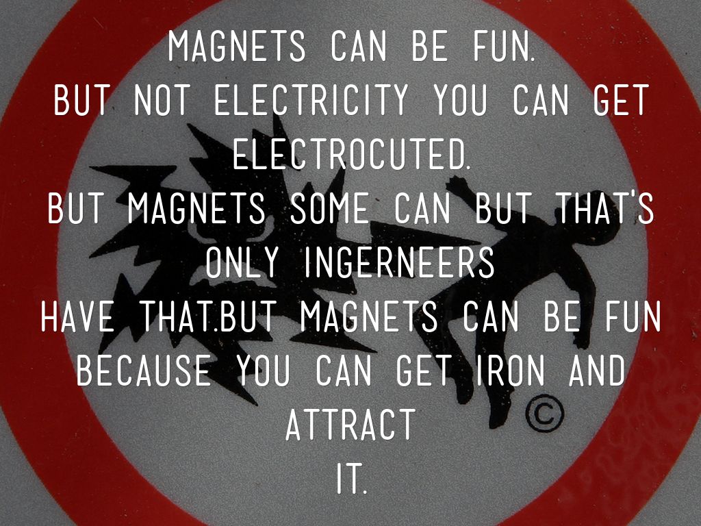 Magnets can be fun. But not electricity you can get electrocuted. But magnets some can but that's only ingerneers Have that.But magnets can be fun because you can get iron and attract It.