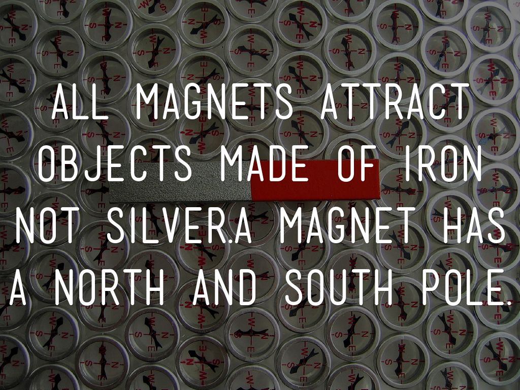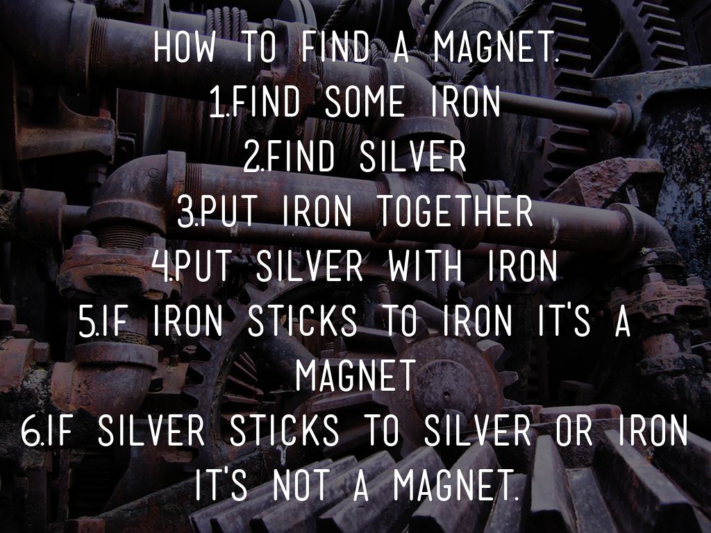 How to find a magnet. 1.find some iron 2.find silver 3.put iron together 4.put silver with iron 5.if iron sticks to iron it's a magnet 6.if silver sticks to silver or iron it's not a magnet.