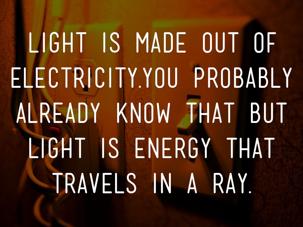Electricity is a kind of energy.The moving electrons make the energy needed to light,lamps and run motors.Power plants make electricity.most power plants use fossil fuels such as oil,coal,and natural gas.Sun light can also make electricity.