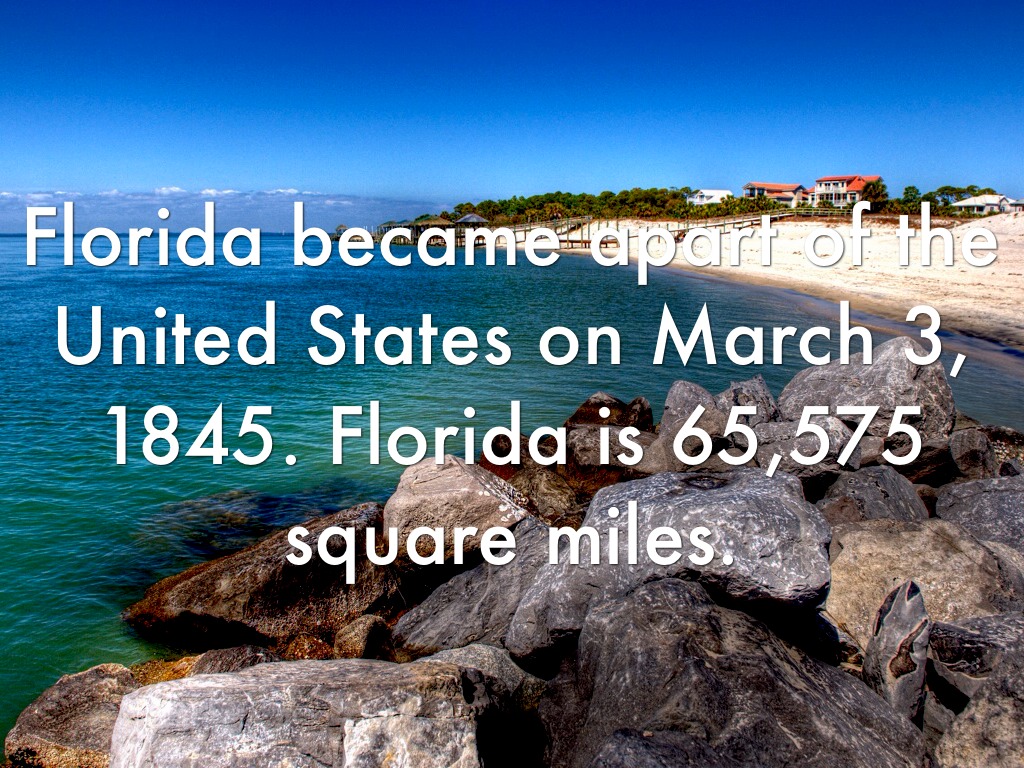 Florida became apart of the United States on March 3, 1845. Florida is 65,575 square miles.