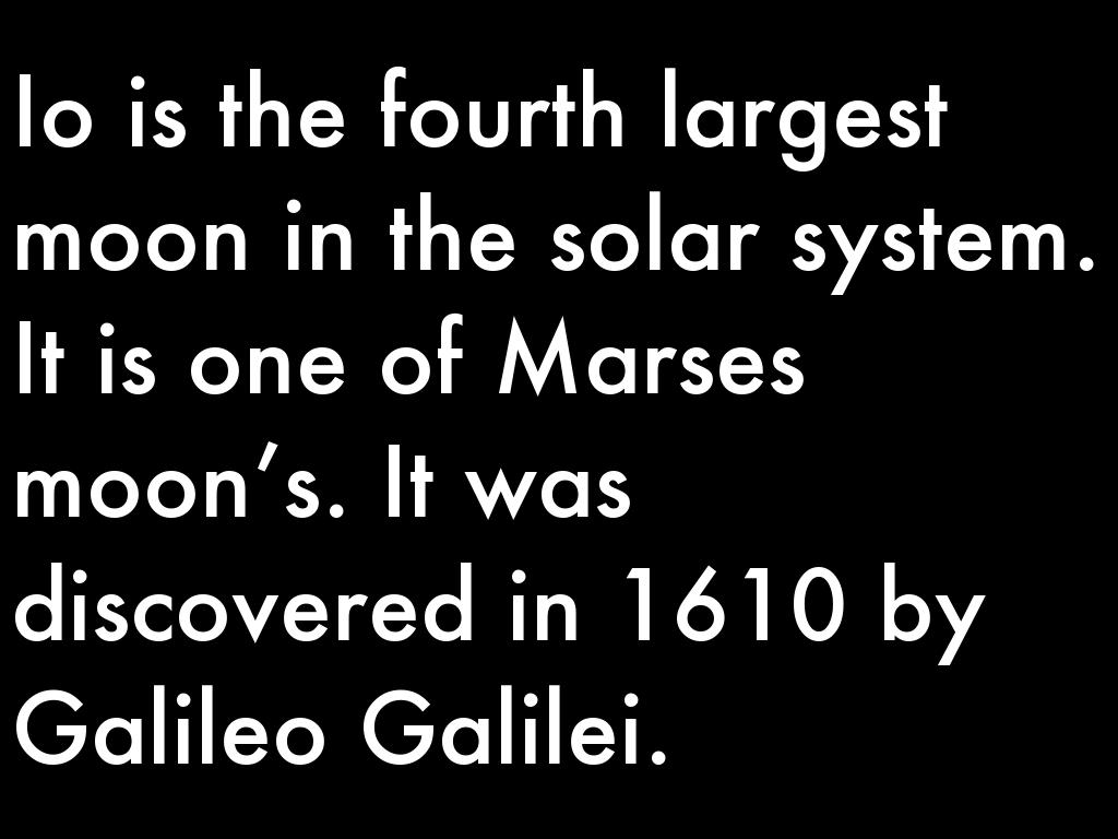 Io is the fourth largest moon in the solar system. It is one of Marses moon’s. It was discovered in 1610 by Galileo Galilei.