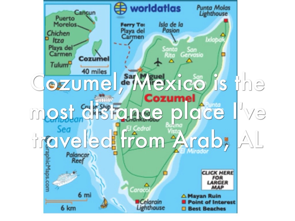 Cozumel, Mexico is the most distance place I've traveled from Arab, AL
