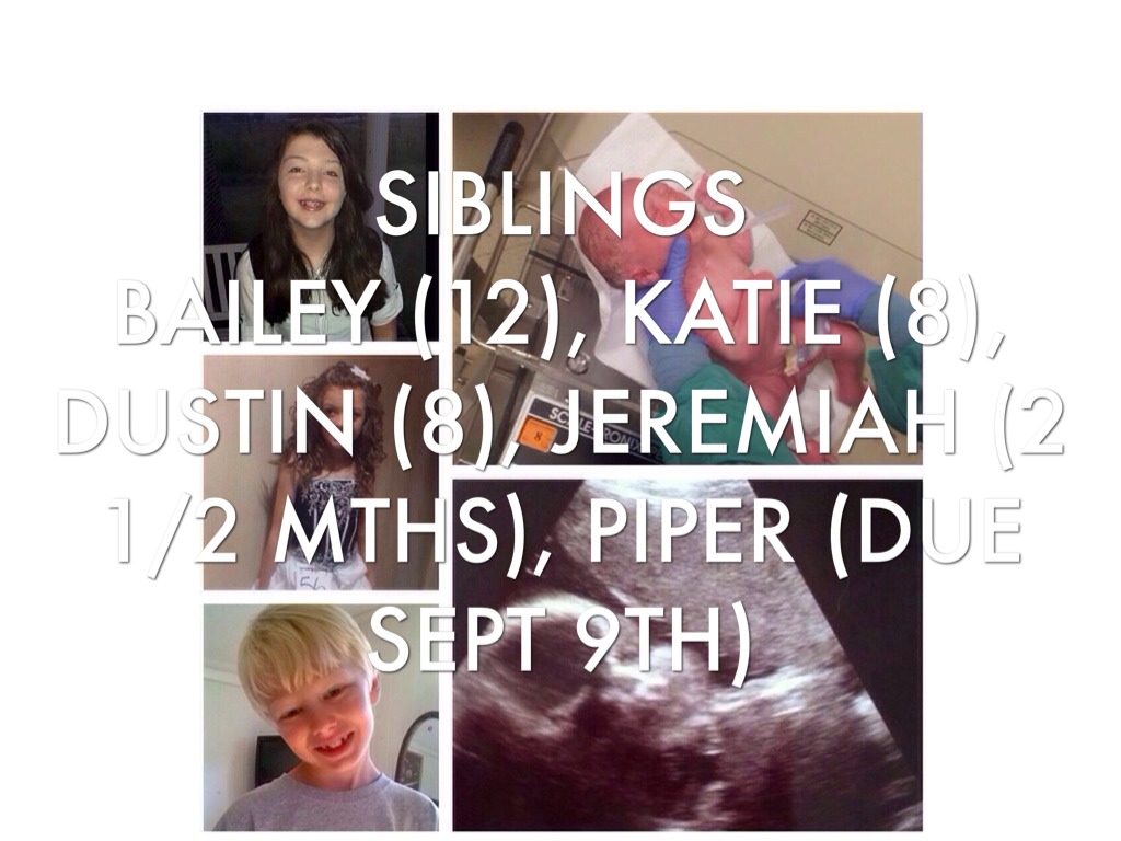 BAILEY (12), KATIE (8), DUSTIN (8), JEREMIAH (2 1/2 MTHS), PIPER (DUE SEPT 9TH)