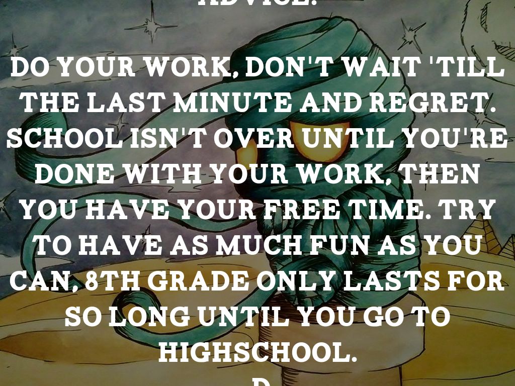 Do your work, don't wait 'till the last minute and regret. School isn't over until you're done with your work, then you have your free time. Try to have as much fun as you can, 8th grade only lasts for so long until you go to highschool. :D