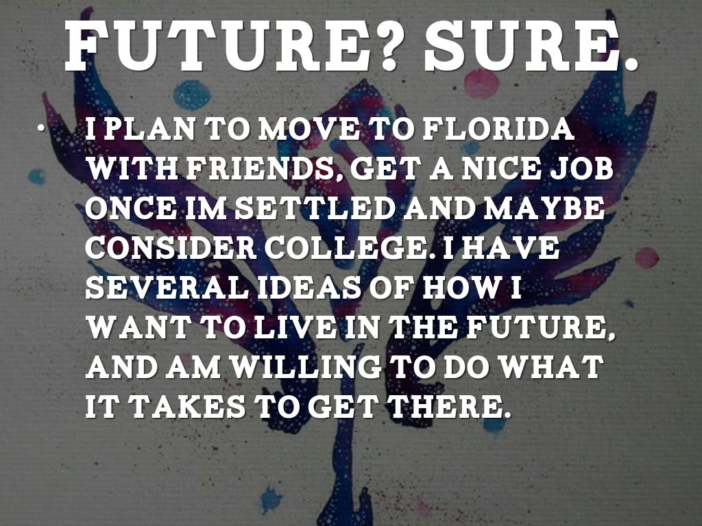 I plan to move to florida with friends, get a nice job once im settled and maybe consider college. I have several ideas of how I want to live in the future, and am willing to do what it takes to get there.