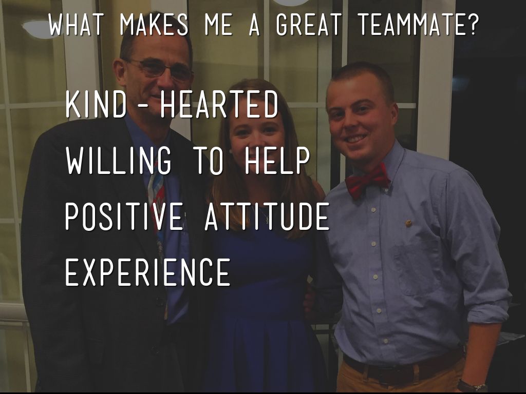 In this presentation about me, I describe how I can make a great teammate in any group setting. With my past leadership and group work skills, I am able to contribute in many positive ways. I hope you enjoy this presentation about me and get to know me a little better! Thanks for viewing!