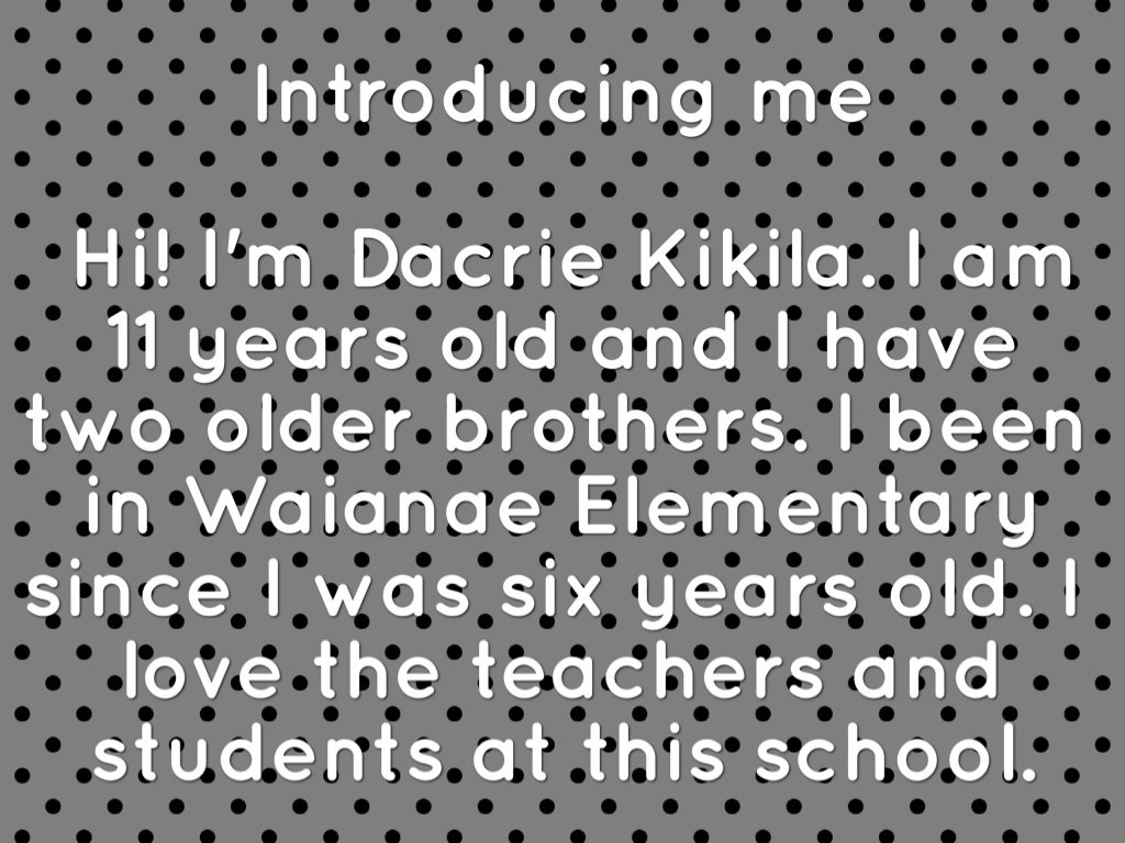 Hi! I'm Dacrie Kikila. I am 11 years old and I have two older brothers. I been in Waianae Elementary since I was six years old. I love the teachers and students at this school.