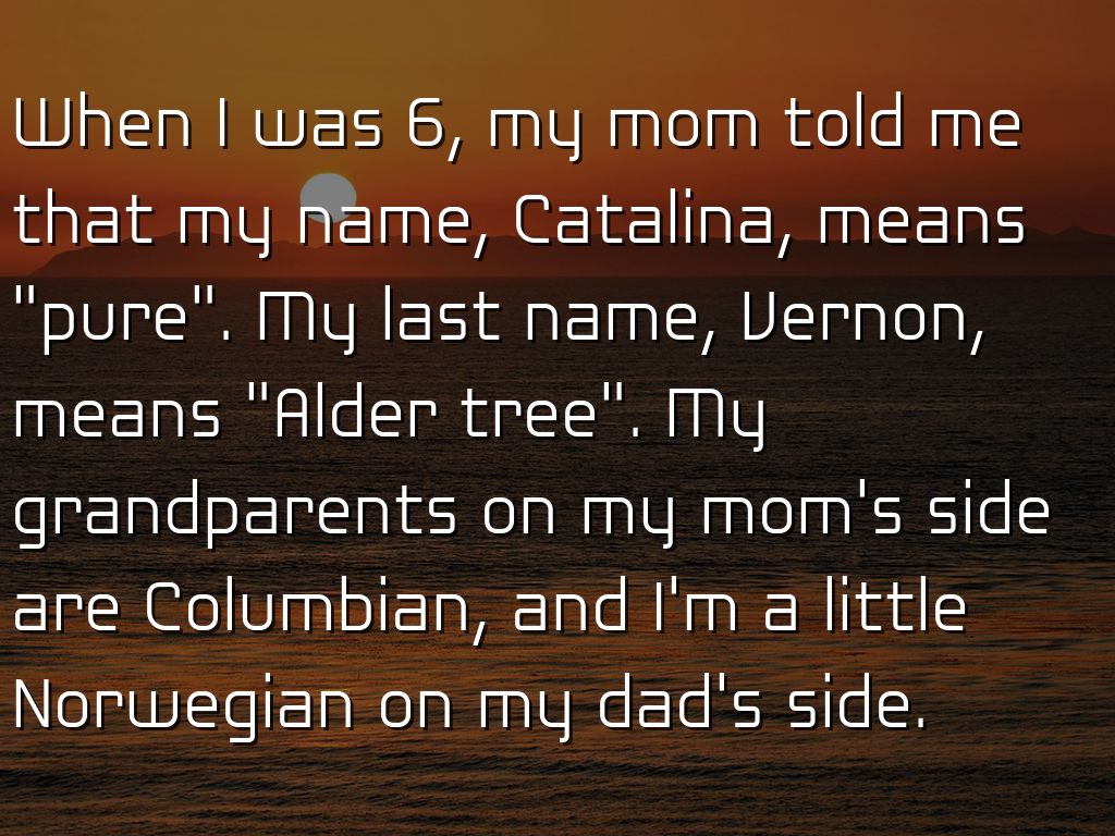 When I was 6, my mom told me that my name, Catalina, means "pure". My last name, Vernon, means "Alder tree". My grandparents on my mom's side are Columbian, and I'm a little Norwegian on my dad's side.