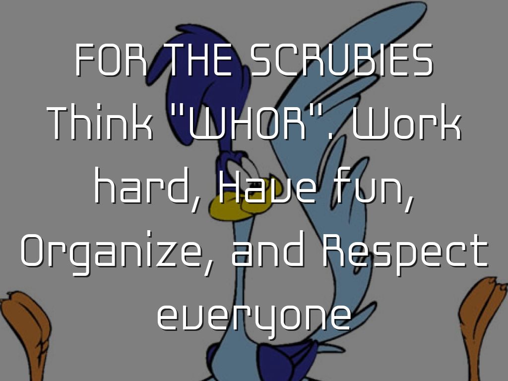 Think "WHOR". Work hard, Have fun, Organize, and Respect everyone