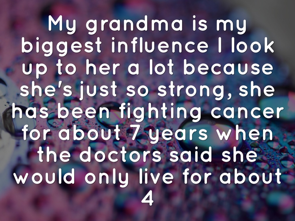 My grandma is my biggest influence I look up to her a lot because she's just so strong, she has been fighting cancer for about 7 years when the doctors said she would only live for about 4