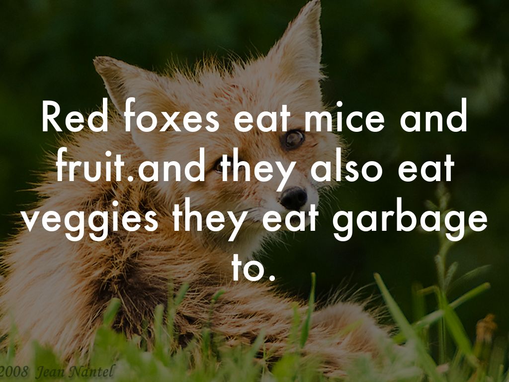 Red foxes eat mice and fruit.and they also eat veggies they eat garbage to.
