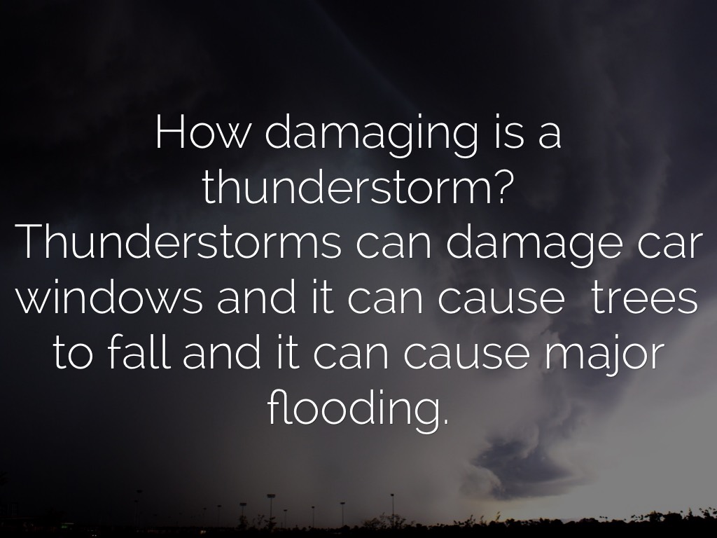 Thunderstorms can damage car windows and it can cause trees to fall and it can cause major flooding.