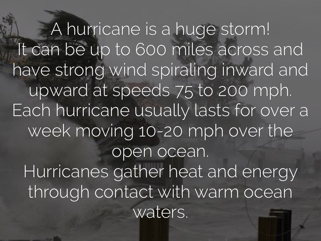 Each hurricane usually lasts for over a week moving 10-20 mph over the open ocean.