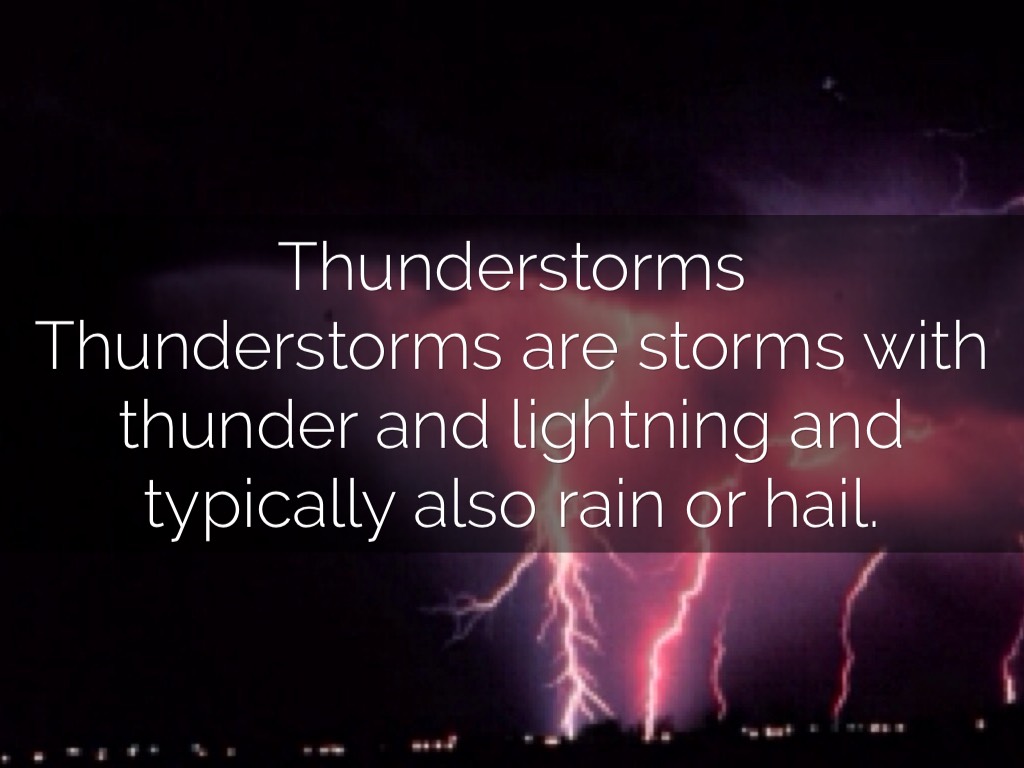 Thunderstorms are storms with thunder and lightning and typically also rain or hail.