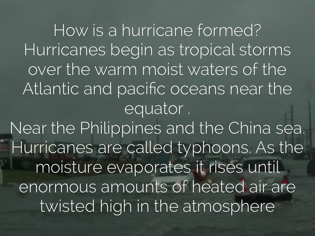 Hurricanes are called typhoons. As the moisture evaporates it rises until enormous amounts of heated air are twisted high in the atmosphere