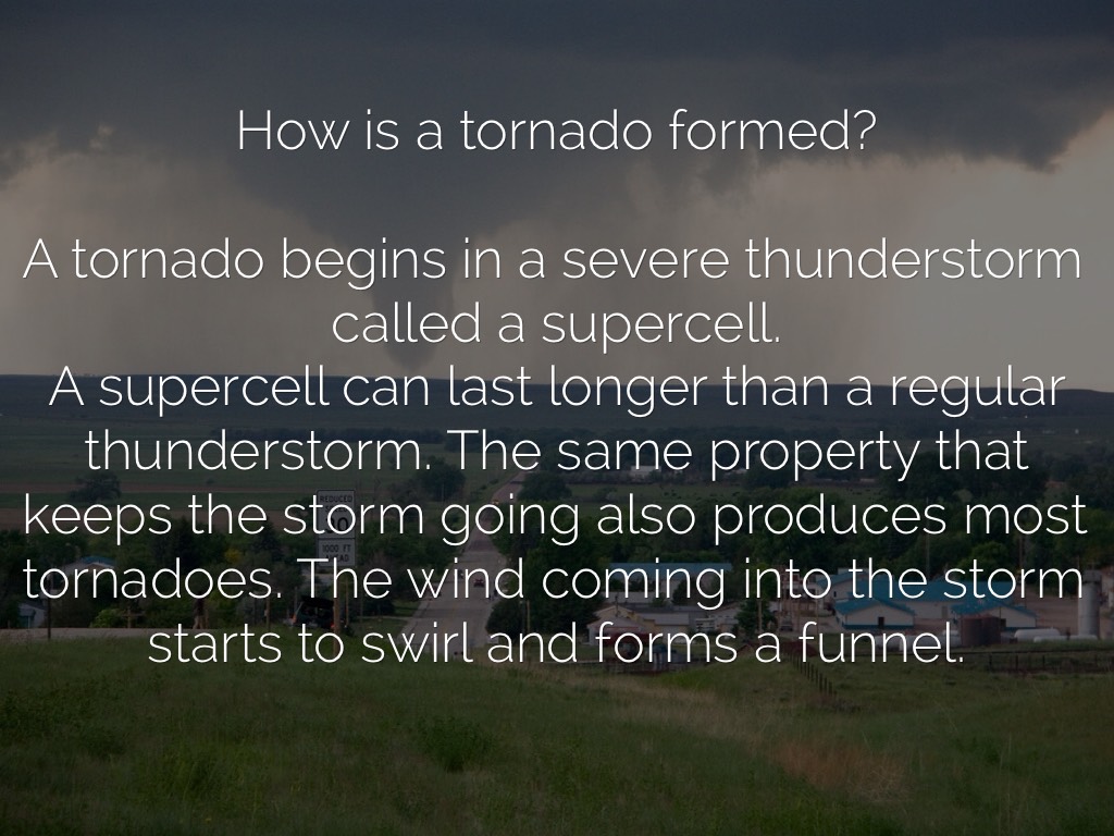 A supercell can last longer than a regular thunderstorm. The same property that keeps the storm going also produces most tornadoes. The wind coming into the storm starts to swirl and forms a funnel.